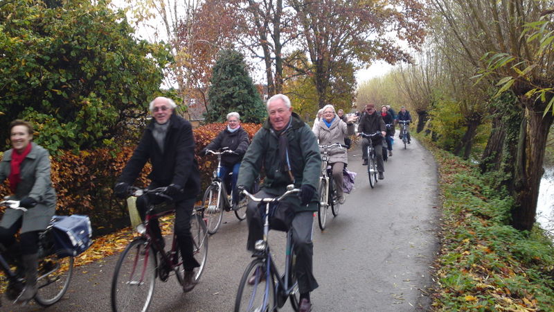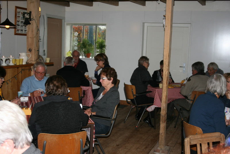 18 november 2012 Herfst bridge-uitje Voor Anneke en Ingrid werd dit een uitermate ontspannen dagje. Voor het eerst was de organisatie niet in hun handen, konden ze alles lekker over zich heen laten komen en hoefden ze zich nergens zorgen over te maken. Dat was ook niet nodig, want de organisatie was bij Elly, Gusta en Tineke in goede handen! Ze hadden voor een mooi programma gezorgd. Om kwart voor tien verzamelden zich alle leden, op Fok na, bij de Tol. Terwijl het nog grijs en druilerig was, vertrokken we per fiets richting Oudewater. Zo ver zouden we echter niet gaan, want net voorbij de camping van Willem Verweij kwamen we al aan bij onze eerste speellocatie. De boerderij van de familie van Winden. In een gezellige ruimte stonden koffie en gebak al klaar en speelden we onze eerste spelronde van drie keer drie spellen. Er werd individueel gespeeld volgens een door Hank Kautz bridge-services ingenieus in elkaar gezet schema. Toen we klaar waren bleek het inmiddels al beter weer geworden en reden we in een licht najaarszonnetje terug naar Linschoten. De volgende stop bleek café het Wapen van Linschoten en Snelrewaard te zijn. Toen ook Henk en Kees waren gearriveerd begonnen we aan de tweede spelronde op de plek waar normaliter onze collega's van BCL spelen. Aansluitend een lunch van broodjes met melk en/of jus. Het volgende programmaonderdeel was een puzzeltocht door ons mooie dorp. Mede door het mooie weer ook een groot succes! De tocht eindigde bij de Tol en daar speelden we de derde en laatste spelronde. De dag werd besloten met een heerlijk buffet met zelf klaar gemaakte salades, hapjes, hartige taarten etc. Een groot compliment aan allen die daaraan hebben meegewerkt. En uiteraard aan Elly, Gusta en Tineke voor het organiseren van deze mooie dag die natuurlijk ook een winnaar kende! Letty die als enige meer dan 60% behaalde, werd overtuigend eerste. Voor de complete uitslag zie uitslag herfst bridge-uitje 2012.