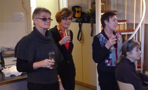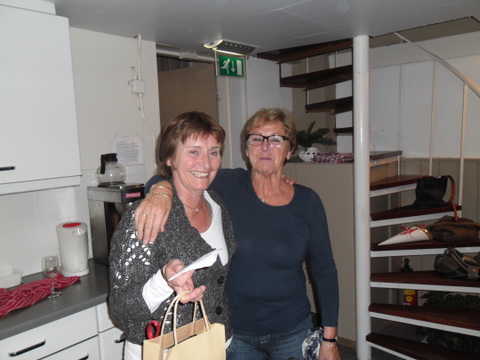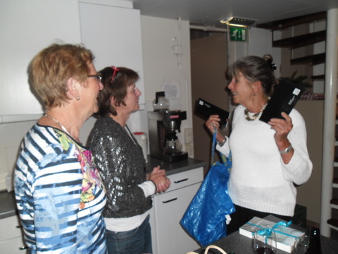 vertrek van Huize Lagendijk .... Iets na elven verzamelden we ons bij De Tol. De sfeer zat er direct weer goed in. Door Ingrid werd in een soort ingelaste en informele ledenvergadering het afgelopen seizoen geëvalueerd. Geconcludeerd kon worden dat iedereen gewoon bijzonder tevreden is en dat er vooral niet (te) veel moet veranderen. Over de vraag of er nog leden bij kunnen werd een stemming gehouden. De uikomst was dat dit er vooralsnog niet meer dan 2 kunnen zijn. Vervolgens werden de diverse vrijwilligers nog in het zonnetje gezet en bedankt met een mooi presentje. Nou ja, een presentje ..... een heuse pen met inscriptie!!! Namens alle brid-ge-noten werden Anneke en Ingrid daarna door Marijke bedankt voor hun inzet, creativiteit en overige bijzondere gaven waardoor zij wederom een mooi seizoen voor ons hebben mogelijk gemaakt. In de grote Ikea tas zaten twee bioscoopbonnen voor een mooie ladiesnight.